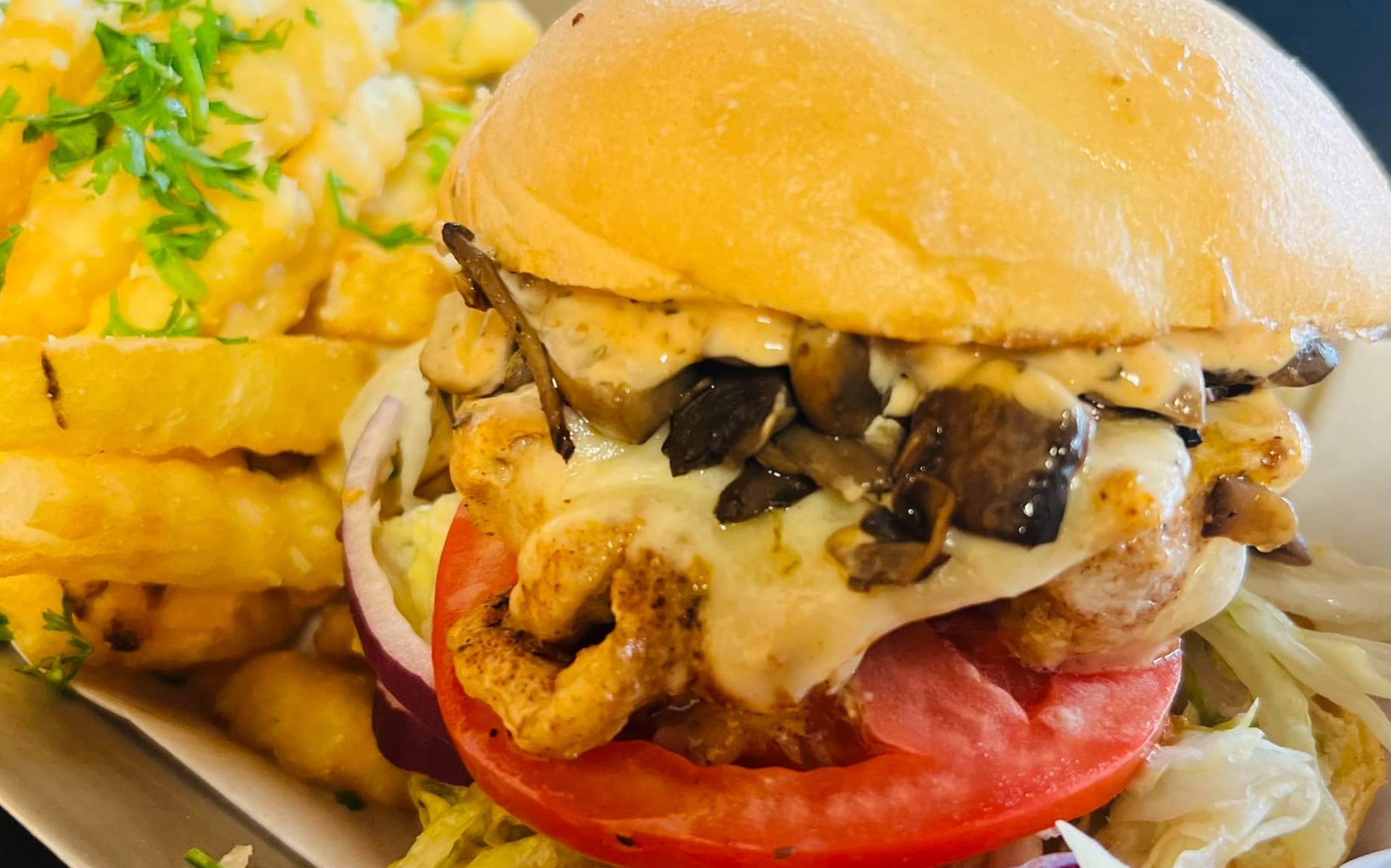 Sink your teeth into our savory garlic burger. Our juicy patty is infused with garlic and grilled to perfection. Topped with melted cheese, crisp lettuce, and ripe tomatoes, it's a flavor explosion. Served with a side of golden fries or a fresh salad, it's a must-try for burger enthusiasts.